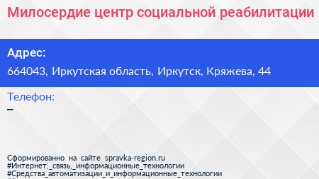 Милосердие, центр социальной реабилитации по адресу 664043, Иркутская область, Иркутск, Кряжева, 44 в дальнейшем Организация, размещена в следующих категориях:
