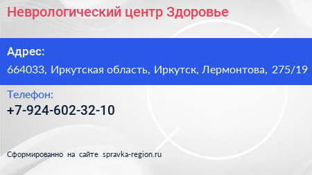 Неврологический центр Здоровье по адресу 664033, Иркутская область, Иркутск, Лермонтова, 275/19 в дальнейшем Организация, размещена в следующих категориях: