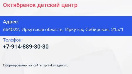 Октябренок, детский центр по адресу 664022, Иркутская область, Иркутск, Сибирская, 21а/1 в дальнейшем Организация, размещена в следующих категориях: