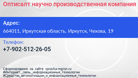 Оптисалт, научно-производственная компания по адресу 664011, Иркутская область, Иркутск, Чехова, 19 в дальнейшем Организация, размещена в следующих категориях: