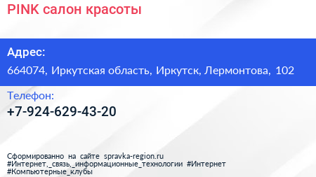 PINK, салон красоты по адресу 664074, Иркутская область, Иркутск, Лермонтова, 102 в дальнейшем Организация, размещена в следующих категориях: