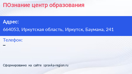 ПОзнание, центр образования по адресу 664053, Иркутская область, Иркутск, Баумана, 241 в дальнейшем Организация, размещена в следующих категориях: