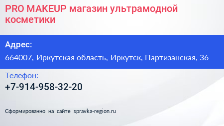 PRO MAKEUP, магазин ультрамодной косметики по адресу 664007, Иркутская область, Иркутск, Партизанская, 36 в дальнейшем Организация, размещена в следующих категориях: