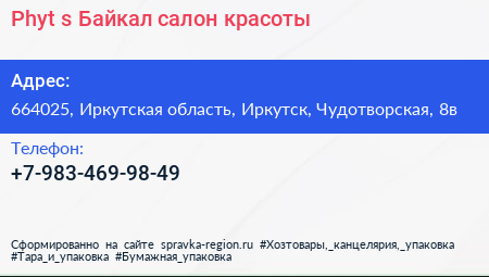 Phyt`s Байкал, салон красоты по адресу 664025, Иркутская область, Иркутск, Чудотворская, 8в в дальнейшем Организация, размещена в следующих категориях: