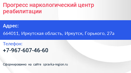 Прогресс, наркологический центр реабилитации по адресу 664011, Иркутская область, Иркутск, Горького, 27а в дальнейшем Организация, размещена в следующих категориях: