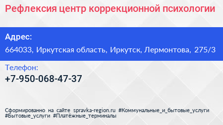 Рефлексия, центр коррекционной психологии по адресу 664033, Иркутская область, Иркутск, Лермонтова, 275/3 в дальнейшем Организация, размещена в следующих категориях: