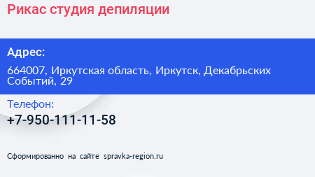 Рикас, студия депиляции по адресу 664007, Иркутская область, Иркутск, Декабрьских Событий, 29 в дальнейшем Организация, размещена в следующих категориях: