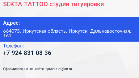 SEKTA TATTOO, студия татуировки по адресу 664075, Иркутская область, Иркутск, Дальневосточная, 161 в дальнейшем Организация, размещена в следующих категориях: