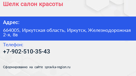 Шелк, салон красоты по адресу 664005, Иркутская область, Иркутск, Железнодорожная 2-я, 8в в дальнейшем Организация, размещена в следующих категориях:
