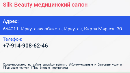 Silk Beauty, медицинский салон по адресу 664011, Иркутская область, Иркутск, Карла Маркса, 30 в дальнейшем Организация, размещена в следующих категориях: