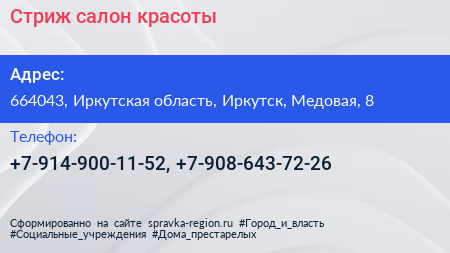 Стриж, салон красоты по адресу 664043, Иркутская область, Иркутск, Медовая, 8 в дальнейшем Организация, размещена в следующих категориях: