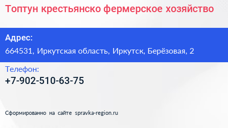 Топтун, крестьянско-фермерское хозяйство по адресу 664531, Иркутская область, Иркутск, Берёзовая, 2 в дальнейшем Организация, размещена в следующих категориях: