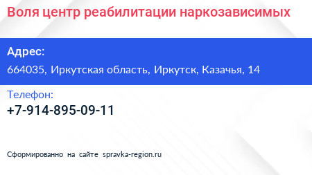 Воля, центр реабилитации наркозависимых по адресу 664035, Иркутская область, Иркутск, Казачья, 14 в дальнейшем Организация, размещена в следующих категориях: