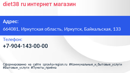 diet38.ru, интернет-магазин по адресу 664081, Иркутская область, Иркутск, Байкальская, 133 в дальнейшем Организация, размещена в следующих категориях:
