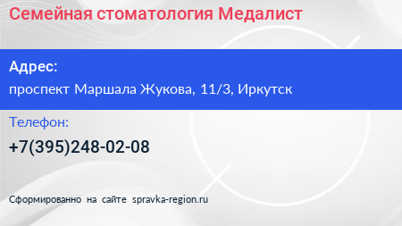 Семейная стоматология «Медалист» по адресу проспект Маршала Жукова, 11/3, Иркутск в дальнейшем Организация, размещена в следующих категориях: