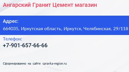 Ангарский Гранит Цемент, магазин по адресу 664035, Иркутская область, Иркутск, Челябинская, 29/118 в дальнейшем Организация, размещена в следующих категориях: