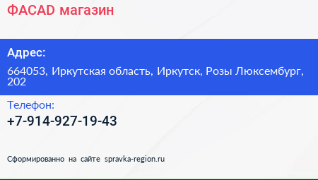 ФАСАD, магазин по адресу 664053, Иркутская область, Иркутск, Розы Люксембург, 202 в дальнейшем Организация, размещена в следующих категориях: