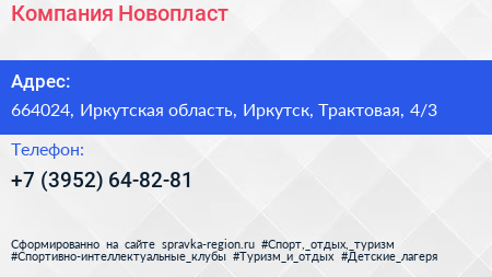 Компания Новопласт по адресу 664024, Иркутская область, Иркутск, Трактовая, 4/3 в дальнейшем Организация, размещена в следующих категориях: