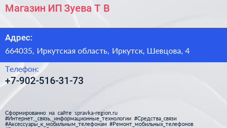 Магазин, ИП Зуева Т.В. по адресу 664035, Иркутская область, Иркутск, Шевцова, 4 в дальнейшем Организация, размещена в следующих категориях: