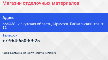 Магазин отделочных материалов по адресу 664038, Иркутская область, Иркутск, Байкальский тракт, 11 в дальнейшем Организация, размещена в следующих категориях: