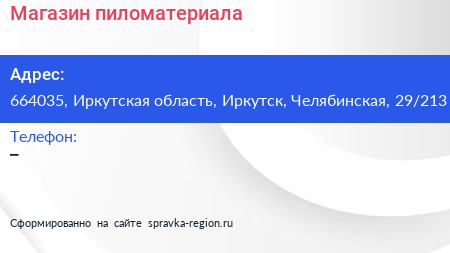 Магазин пиломатериала по адресу 664035, Иркутская область, Иркутск, Челябинская, 29/213 в дальнейшем Организация, размещена в следующих категориях: