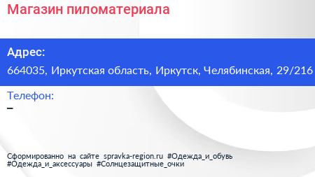 Магазин пиломатериала по адресу 664035, Иркутская область, Иркутск, Челябинская, 29/216 в дальнейшем Организация, размещена в следующих категориях: