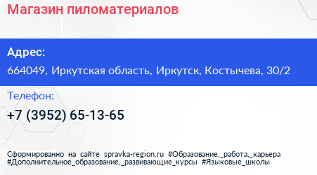Магазин пиломатериалов по адресу 664049, Иркутская область, Иркутск, Костычева, 30/2 в дальнейшем Организация, размещена в следующих категориях: