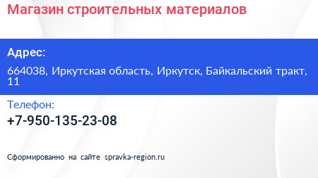 Магазин строительных материалов по адресу 664038, Иркутская область, Иркутск, Байкальский тракт, 11 в дальнейшем Организация, размещена в следующих категориях: