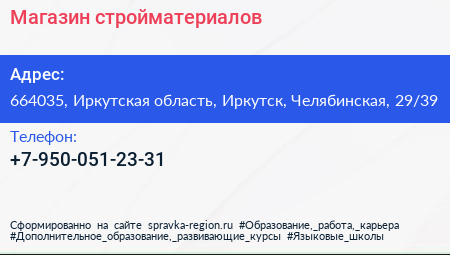 Магазин стройматериалов по адресу 664035, Иркутская область, Иркутск, Челябинская, 29/39 в дальнейшем Организация, размещена в следующих категориях: