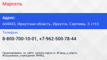 Марсель по адресу 664043, Иркутская область, Иркутск, Сергеева, 3 ст11 в дальнейшем Организация, размещена в следующих категориях: