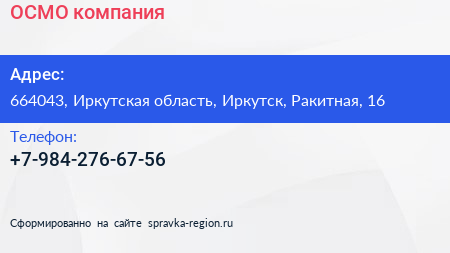 ОСМО, компания по адресу 664043, Иркутская область, Иркутск, Ракитная, 16 в дальнейшем Организация, размещена в следующих категориях: