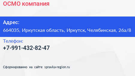 ОСМО, компания по адресу 664035, Иркутская область, Иркутск, Челябинская, 26а/8 в дальнейшем Организация, размещена в следующих категориях: