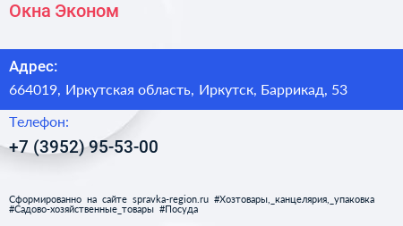 Окна Эконом по адресу 664019, Иркутская область, Иркутск, Баррикад, 53 в дальнейшем Организация, размещена в следующих категориях: