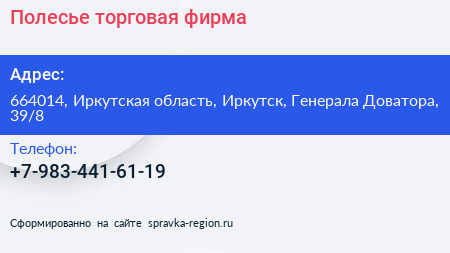 Полесье, торговая фирма по адресу 664014, Иркутская область, Иркутск, Генерала Доватора, 39/8 в дальнейшем Организация, размещена в следующих категориях:
