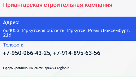 Приангарская, строительная компания по адресу 664053, Иркутская область, Иркутск, Розы Люксембург, 216 в дальнейшем Организация, размещена в следующих категориях: