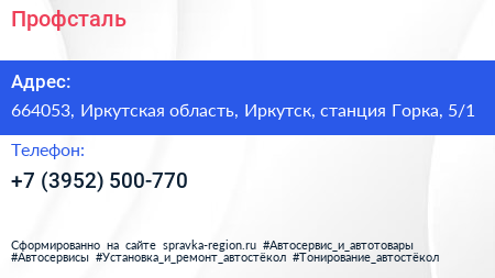 Профсталь по адресу 664053, Иркутская область, Иркутск, станция Горка, 5/1 в дальнейшем Организация, размещена в следующих категориях: