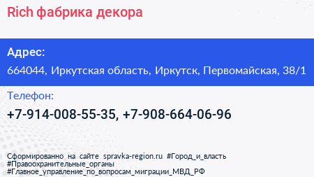 Rich, фабрика декора по адресу 664044, Иркутская область, Иркутск, Первомайская, 38/1 в дальнейшем Организация, размещена в следующих категориях: