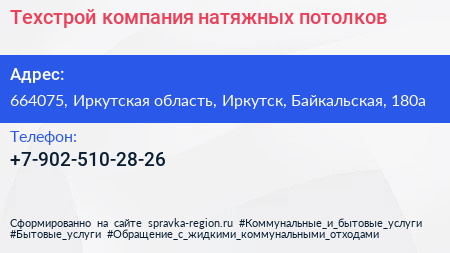 Техстрой, компания натяжных потолков по адресу 664075, Иркутская область, Иркутск, Байкальская, 180а в дальнейшем Организация, размещена в следующих категориях: