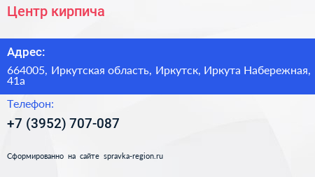 Центр кирпича по адресу 664005, Иркутская область, Иркутск, Иркута Набережная, 41а в дальнейшем Организация, размещена в следующих категориях:
