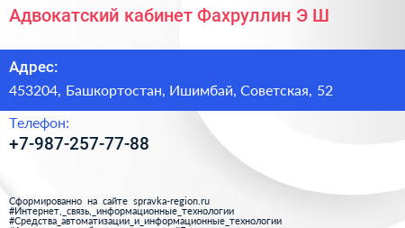 Адвокатский кабинет Фахруллин Э.Ш. по адресу 453204, Башкортостан, Ишимбай, Советская, 52 в дальнейшем Организация, размещена в следующих категориях: