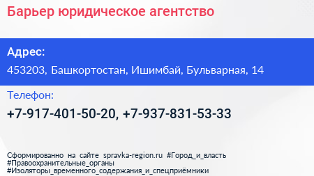 Барьер, юридическое агентство по адресу 453203, Башкортостан, Ишимбай, Бульварная, 14 в дальнейшем Организация, размещена в следующих категориях: