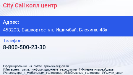City Call, колл-центр по адресу 453203, Башкортостан, Ишимбай, Блохина, 48а в дальнейшем Организация, размещена в следующих категориях: