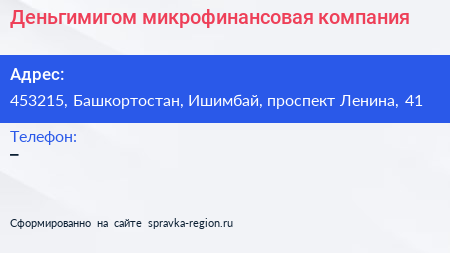 Деньгимигом, микрофинансовая компания по адресу 453215, Башкортостан, Ишимбай, проспект Ленина, 41 в дальнейшем Организация, размещена в следующих категориях: