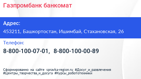 Газпромбанк, банкомат по адресу 453211, Башкортостан, Ишимбай, Стахановская, 26 в дальнейшем Организация, размещена в следующих категориях: