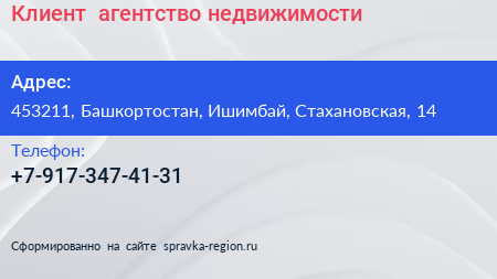 Клиент+, агентство недвижимости по адресу 453211, Башкортостан, Ишимбай, Стахановская, 14 в дальнейшем Организация, размещена в следующих категориях:
