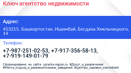 Ключ, агентство недвижимости по адресу 453215, Башкортостан, Ишимбай, Богдана Хмельницкого, 14 в дальнейшем Организация, размещена в следующих категориях: