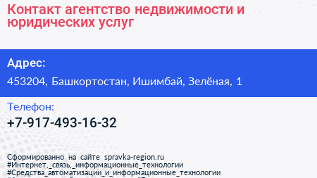 Контакт, агентство недвижимости и юридических услуг по адресу 453204, Башкортостан, Ишимбай, Зелёная, 1 в дальнейшем Организация, размещена в следующих категориях: