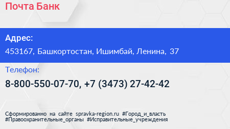 Почта Банк по адресу 453167, Башкортостан, Ишимбай, Ленина, 37 в дальнейшем Организация, размещена в следующих категориях: