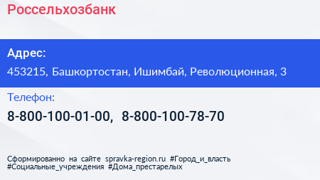 Россельхозбанк по адресу 453215, Башкортостан, Ишимбай, Революционная, 3 в дальнейшем Организация, размещена в следующих категориях: