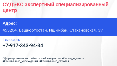 СУДЭКС, экспертный специализированный центр по адресу 453204, Башкортостан, Ишимбай, Стахановская, 39 в дальнейшем Организация, размещена в следующих категориях: